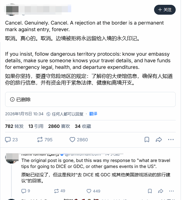 社交媒体上,非美国游戏从业者对赴美参会的安全担忧早已持续发酵。有从业者在社交平台Bluesky上给出直白建议:“真的别去了,拒签会污染你的护照。如果坚持要去,需遵循危险区域出行准则:熟记本国使馆信息,确保有人知晓你的行程细节,并备好紧急法律事务、医疗及离境所需资金。”