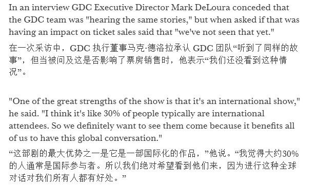 值得注意的是,调查报告发布当天,GDC执行董事马克·德洛拉在接受GamesIndustry采访时,给出了截然不同的表态。他表示,尽管外界对赴美参会的担忧不断,但其并未发现GDC门票销量受到影响,同时公开鼓励国际旅行者前往参会。“该展会的一大优势在于其国际性,”德洛拉强调,“通常约30%的参会者是国际人士,我们非常希望他们能前来参会,因为这种全球性对话对我们所有人都有益。”