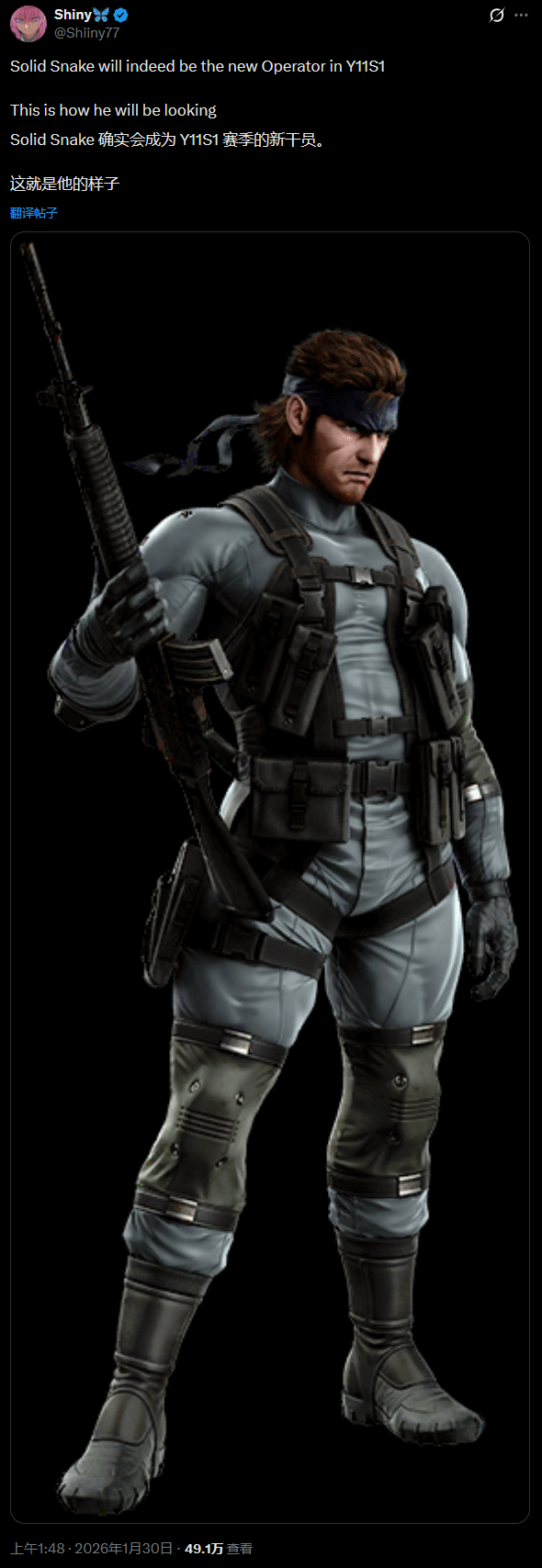 据悉,此次联动爆料由《彩虹六号:围攻X》知名数据挖掘者Shiny率先披露,根据其透露的信息,“固蛇”联动内容将被纳入游戏第11年第1赛季,该赛季暂定于今年3月正式上线。随后,Insider Gaming也通过独立消息渠道核实,确认了这一泄露内容的真实性。