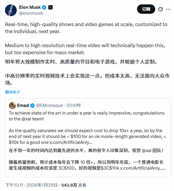 此次马斯克的全新预测,源于其对一则相关帖子的回应,该帖子重点提及xAI旗下Grok Imagine AI视频生成工具的人气与质量正持续提升。据悉,Grok Imagine目前已实现10秒AI视频生成,音画质均有显著升级,还能支持纯文本或静态照片转化为动态视频,这也为其后续涉足游戏生成领域奠定了技术基础。除了2027年的宏大目标,帖子还提到,中高分辨率AI生成视频有望在今年落地,但受限于高昂成本,短期内难以普及至大众市场,这一表述也被外界认为具有较高可信度。