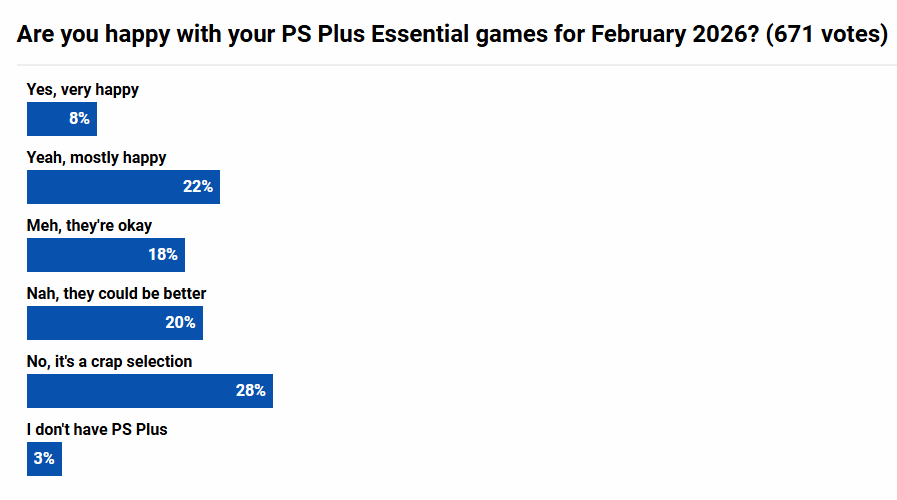 外媒pushsquare针对本次会免阵容的玩家反馈进行统计,整体结果十分惨淡:仅有8%的玩家对阵容表示非常满意,18%的玩家认为表现一般,20%的玩家觉得“不太行,本可以更好”,还有28%的玩家直言阵容很糟、完全不满意,绝大多数玩家都对此次会免感到失望。