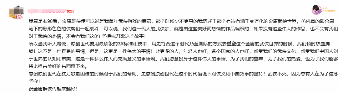 实机PV曝光后,玩家群体反响热烈。多数玩家对这款开放世界版《金庸群侠传》充满期待,盼望它能打破传统武侠游戏的局限,让更多人领略到武侠文化的独特魅力;也有部分玩家结合自身体验给出建议,希望游戏能在开放世界自由度、武侠战斗特色上实现更大突破,打造出差异化的江湖体验。