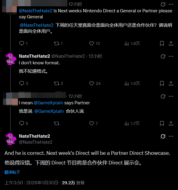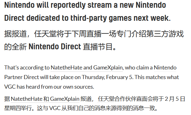 这一消息最早由知名爆料人士Nate The Hate与GameXplain先后披露,二者均明确表示,即将到来的这场任天堂直面会,并非聚焦第一方独占作品,而是专门为第三方合作伙伴打造的展示专场,集中呈现第三方厂商的相关游戏动态。