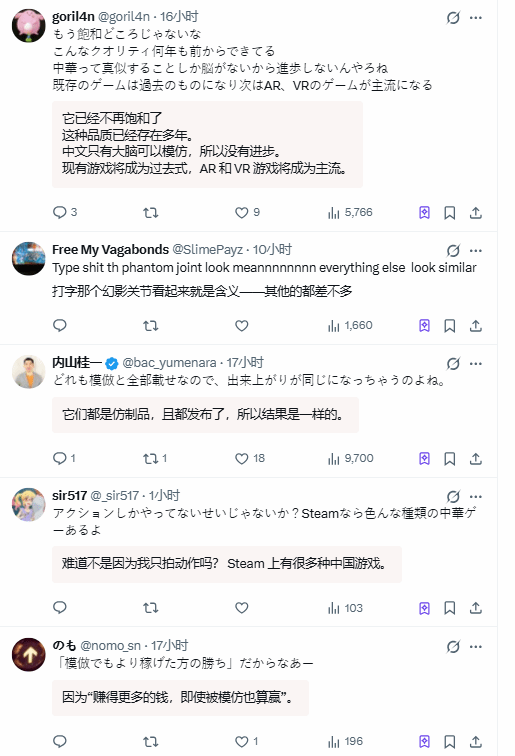 不同于国内玩家的大多赞叹,日网社交平台上的声音格外尖锐。日本博主@kyabetsuhuman转发该实机演示时,一语道破争议核心:“质量确实很高,但最近的中国游戏外表看起来实在太雷同了。”简单一句话,迅速引发大批海外玩家共鸣,原本聚焦画面的讨论,彻底转向对国产游戏缺乏新意、千篇一律的担忧与吐槽。