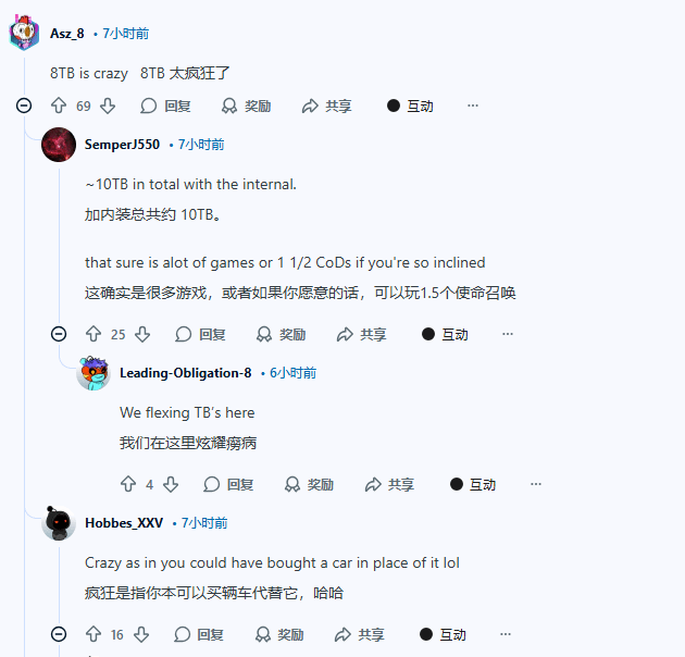 网友们的留言满是酸意与惊叹:“8TB也太疯狂了”“这种疯狂程度,约等于你本可以用买硬盘的钱去买台车,哈哈”;还有人调侃道:“赶紧把戒指准备好!顺便问下,她还有姐妹吗?”“怎么老是这种‘我女朋友给了我惊喜’的帖子,酸了”;也有网友直言这份礼物的大手笔:“单是那块8TB的硬盘,价格就比PS5 Pro主机还要贵,真不知道她存了多久的钱”。