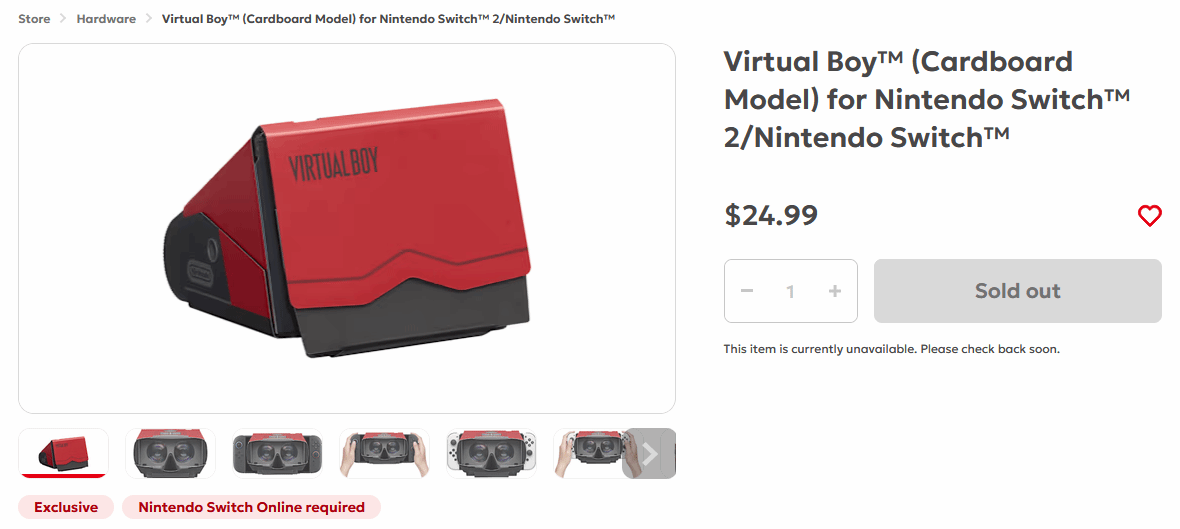据媒体The Gamer报道,时隔21年再度回归,Virtual Boy意外获得了玩家的广泛关注,热度远超预期。此次重新推出的机型,可兼容Switch初代和Switch 2两款设备,共推出两个版本供玩家选择:定价100美元的主机本体,港版售价为499港币,换算成人民币约443元;还有定价25美元的纸模型版本,港版售价149港币,折合人民币约132元。