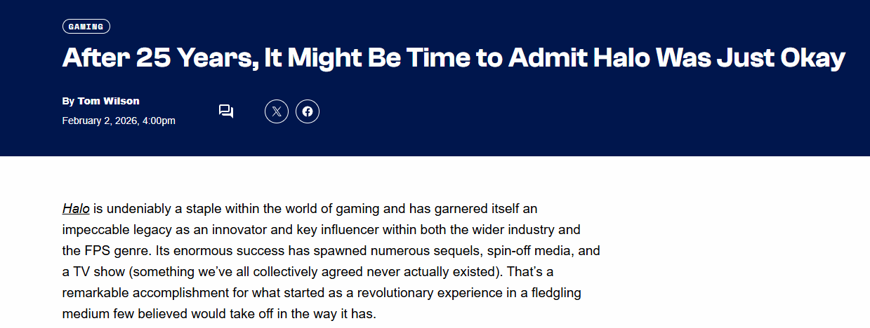 站在2026年的视角回看,《光环》的重制版作品也暴露出了不少问题,关卡设计重复、AI难度过高、存档点设置不合理等,都让实际游玩体验充满挫败感。即便游戏在配乐制作、武器系统设计等方面有着亮眼表现,但综合来看,依旧只能算作一款平庸的FPS作品。在游戏市场中,不少有着创新设计的作品比如《命运》,最终都被市场埋没,Tom Wilson认为,若是《光环》诞生在当下的游戏环境中,自身的诸多短板必然会让它落得同样的下场,而与《光环》同源同质却口碑不佳的《命运》,就是最直接的证明。