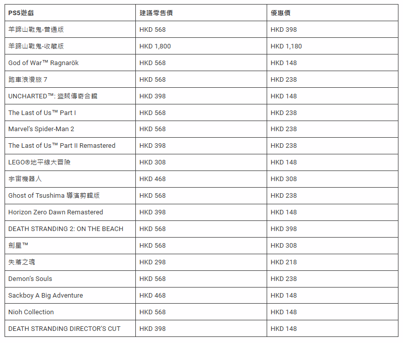 游戏方面,多款PlayStation独占大作及热门作品同步加入优惠阵营,性价比拉满:《羊蹄山之魂》普通版优惠价398港元,收藏版1,180港元;《死亡搁浅2:冥滩之上》优惠后定价398港元;《战神5:诸神黄昏》降价力度显著,低至148港元;《漫威蜘蛛侠2》与《宇宙机器人》分别降至238港元、308港元,满足不同玩家的购买需求。