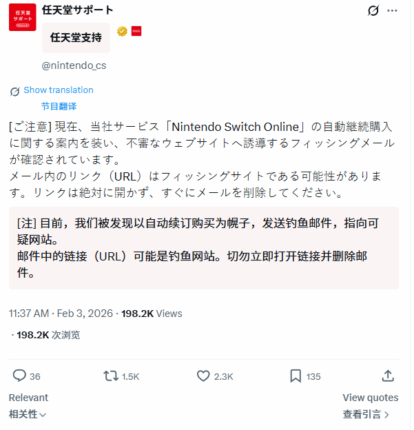任天堂官方发布安全警示公告,证实近期有不法分子伪造NintendoSwitchOnline自动续费通知,向用户发送钓鱼邮件,这类邮件的核心目的是诱导用户点击可疑链接,进而威胁用户的账号信息安全与财产安全。