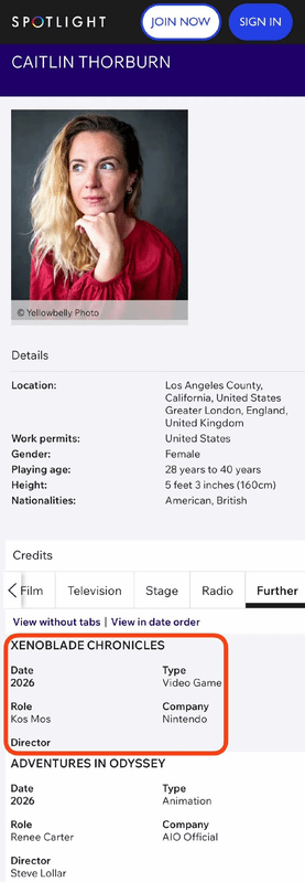 有网友在Spotlight平台留意到一则关键信息:曾为《异度之刃2》中高人气异刃KOS-MOS配音的英文声优凯特琳·索伯恩,近期更新了其个人主页上的职业履历。