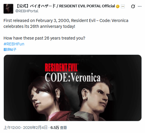 卡普空官方于当地时间2月3日发文,正式庆祝经典生存恐怖游戏《生化危机:代号 维罗妮卡》发售26周年,原本一场温情怀旧的纪念,却意外演变成玩家集体呼吁重制的“催更现场”。