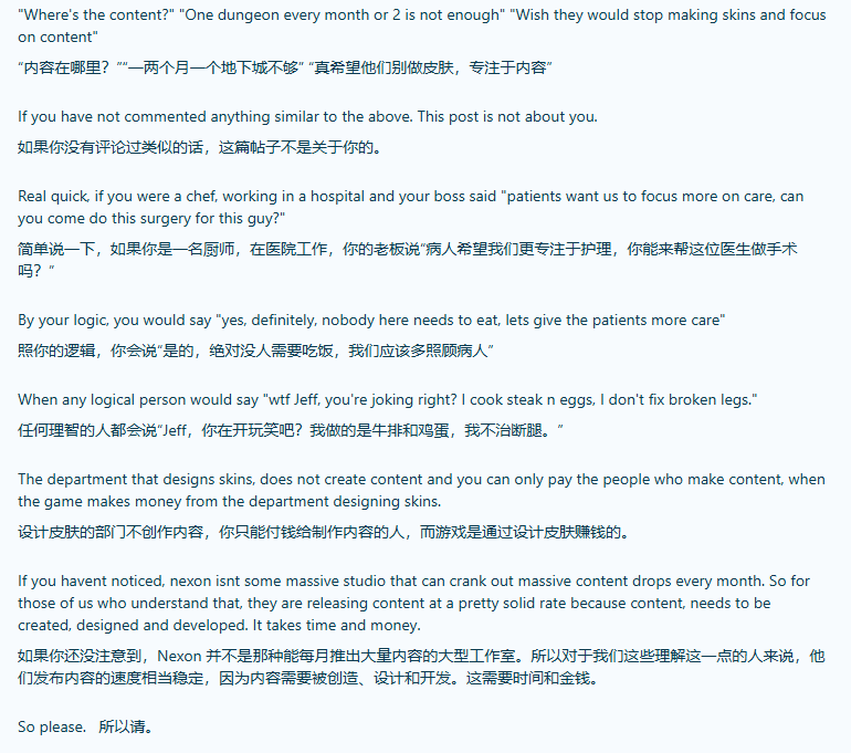 这位发文玩家表示,把皮肤更新频繁和内容开发缓慢绑定在一起,是完全没有逻辑的错误认知。他用一个形象的例子解释道:“假如你是医院食堂的厨师,老板突然让你放下手里的厨具,去给病人做一台手术,你会同意吗?”他明确指出,负责皮肤设计的团队和专注于游戏核心内容开发的团队,是两个完全独立的群体,两者的工作并不冲突,也不会互相影响。