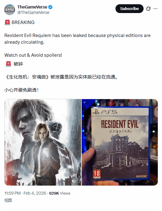 近日,X平台账号TheGameVerse发布帖子,声称《生化危机9:安魂曲》的实体版已经遭到泄露,还附上了一张玩家手持疑似该游戏“实体版”包装的照片,试图证实爆料的真实性。据悉,《生化危机9:安魂曲》定于2月27日正式发售,登陆多平台,此前外网也确实出现过实体游戏盘相关的传闻。
