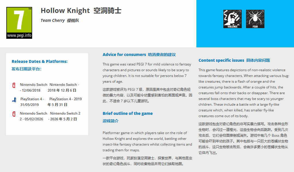 此次PEGI评级将《空洞骑士:丝之歌》Switch2版定为“7岁以上”级别,评级结果显示,游戏内容温和,无不良导向,完全符合该级别的相关标准,这也意味着游戏在内容审核上已无阻碍,为后续顺利发售奠定了基础。