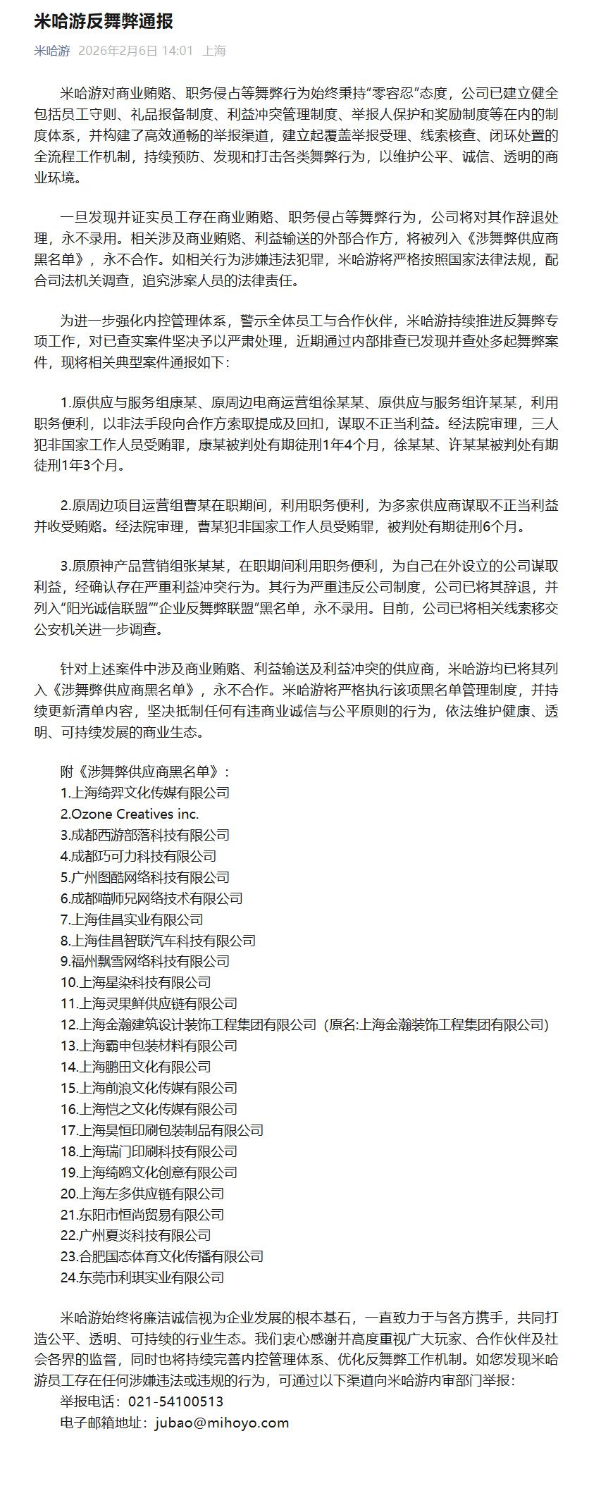 米哈游官方对外发布反舞弊专项通报,明确传递出对商业贿赂、职务侵占等舞弊行为的零容忍态度,同时披露了近期多起舞弊案件的查处结果,多名涉事人员被依法判刑,相关供应商也遭到永久封禁处理。