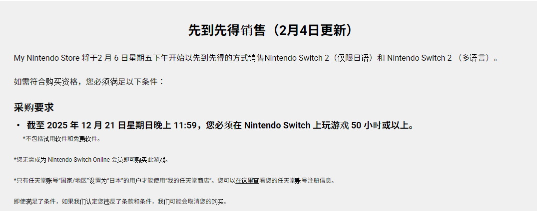 此次现货直售虽解了玩家抢购之苦,但仍有硬性门槛:玩家账号下初代Switch累计游戏时长需满50小时,否则无法购买。