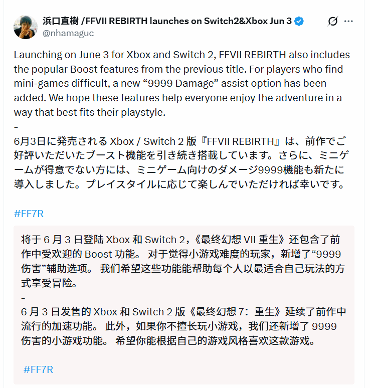 《最终幻想7 重生》(Final Fantasy VII Rebirth)迎来重大官宣,导演滨口直树于今日正式发文,确认这款经典IP新作将于2026年6月3日登陆Xbox Series X|S与任天堂Switch 2两大平台,更值得关注的是,新平台版本将新增专属“官方辅助功能”,堪称玩家福音。