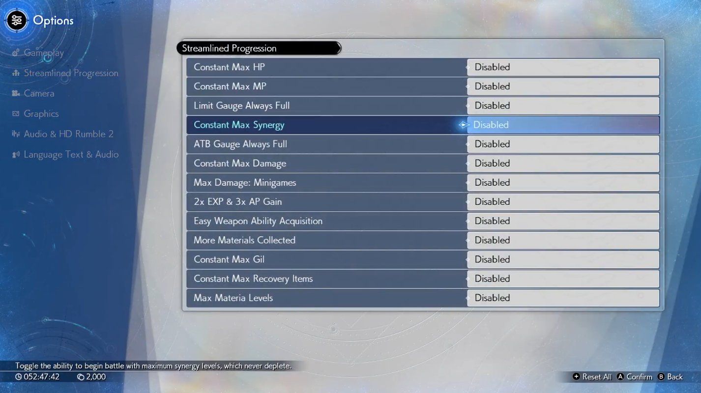 这套被玩家戏称为“官方内置挂”的辅助功能,开启后能让角色直接进入“无敌模式”:HP、MP、Limit极限槽、ATB槽及联手技能槽将全程保持满值状态,战斗中单次攻击伤害可固定为9999点,实现对所有敌人的秒杀效果。除此之外,辅助功能还包含多项便利设定,比如2倍经验值、3倍技能点(AP)获取,材料收集数量翻倍,以及魔晶石直接解锁满级等。
