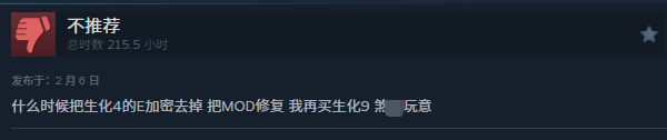 性能的严重倒退彻底引发玩家不满,近三天《生化危机4 重制版》在Steam遭到大量差评轰炸。愤怒的玩家向卡普空发出警告,若不移除Enigma新加密,将拒绝购买系列新作《生化危机9》。此外,加密更换还导致多款游戏MOD失效,进一步加剧了玩家抵触情绪。