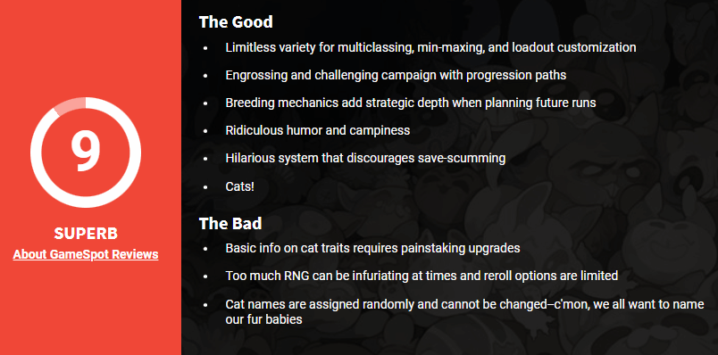 GS给出的最终评分为9分,这款作品的亮点十分突出:多职业的搭配组合、极限属性的养成以及装备的灵活搭配,让游戏拥有了近乎无限的玩法多样性;战役模式不仅引人入胜,难度设置也颇具挑战性,同时还为玩家提供了多种不同的成长路线可供选择;独特的繁殖机制,为玩家规划后续挑战流程增添了更多战略层面的考量;游戏整体风格荒诞搞笑,充斥着满满的恶趣味,幽默感十足;此外,游戏还加入了一套特殊系统,能够有效避免玩家通过反复读档来刷取理想结果;而可爱的猫咪元素,更是为游戏加分不少。