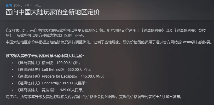 昨日,《逃离塔科夫》Steam官方页面发布公告,宣布将为中国大陆地区玩家推出专属定价,实行永久降价政策,这一消息迅速引发国内玩家关注。根据公告内容,此次降价将于2月10日正式落地生效,游戏多个版本均将迎来大幅调价。