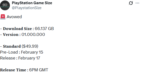 游戏资讯账号@PlaystationSize 于今日公布了开放世界游戏《宣誓》PlayStation版本的详细信息。据悉,该游戏PS版的下载体积为66.137 GB,初始版本号为01.000.000,标准版售价设定为49.99美元。关于发售相关的时间安排已明确,2月15日将开启预加载通道,2月17日正式上线发售,北京时间凌晨两点将迎来解锁。