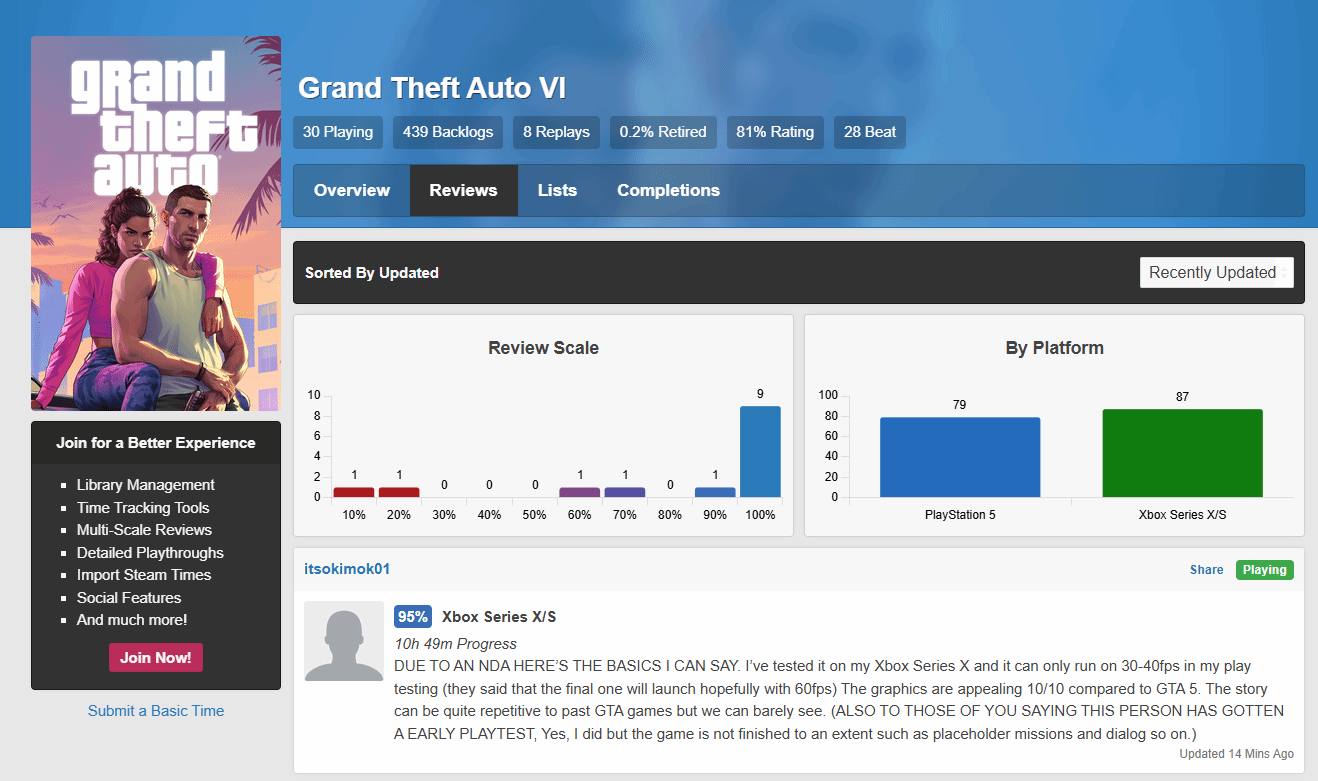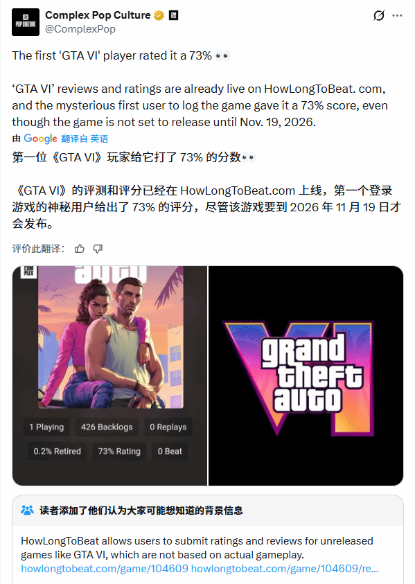 一则关于《GTA6》的离谱消息引发玩家热议——知名游戏媒体Complex Pop Culture通过推文爆料,距离原定2026年11月19日的发售日期还有近一年时间,这款未正式问世的作品,竟已在游戏时长统计网站HowLongToBeat上,出现了大量玩家评分和详细“评测”内容。