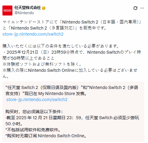 为了杜绝黄牛囤货、确保新主机能真正送到核心玩家手中,任天堂为此次直售设置了明确的购买门槛,这也是最受争议的一点。官方规定,想要购买新主机的用户,其名下的任天堂账号,需在2025年12月21日23时59分之前,累计游玩任天堂Switch主机的时长达到50小时及以上,且该时长不包含体验版游戏与免费软件的游玩时间,相当于给真正的玩家发放了“优先购买权”,从源头遏制黄牛炒作乱象。
