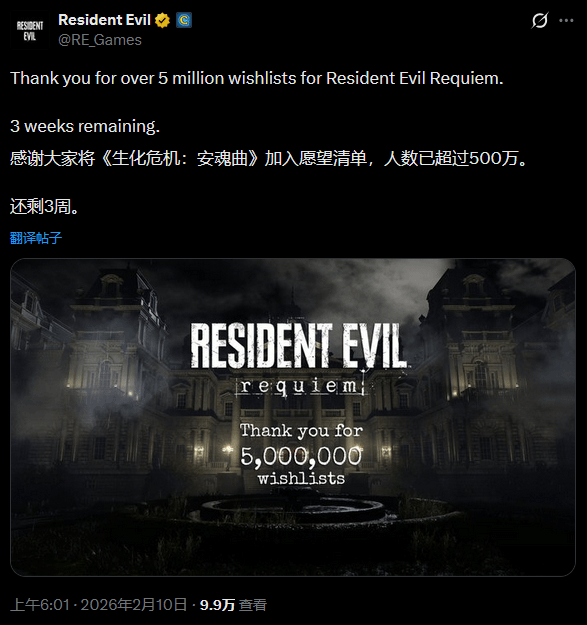 2月10日,《生化危机》官方对外通报,《生化危机9:安魂曲》的愿望单添加人数已成功突破500万大关。与此同时,官方也向广大玩家同步提醒,目前距离这款新作正式发售,仅剩不到3周时间。