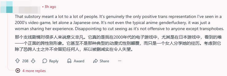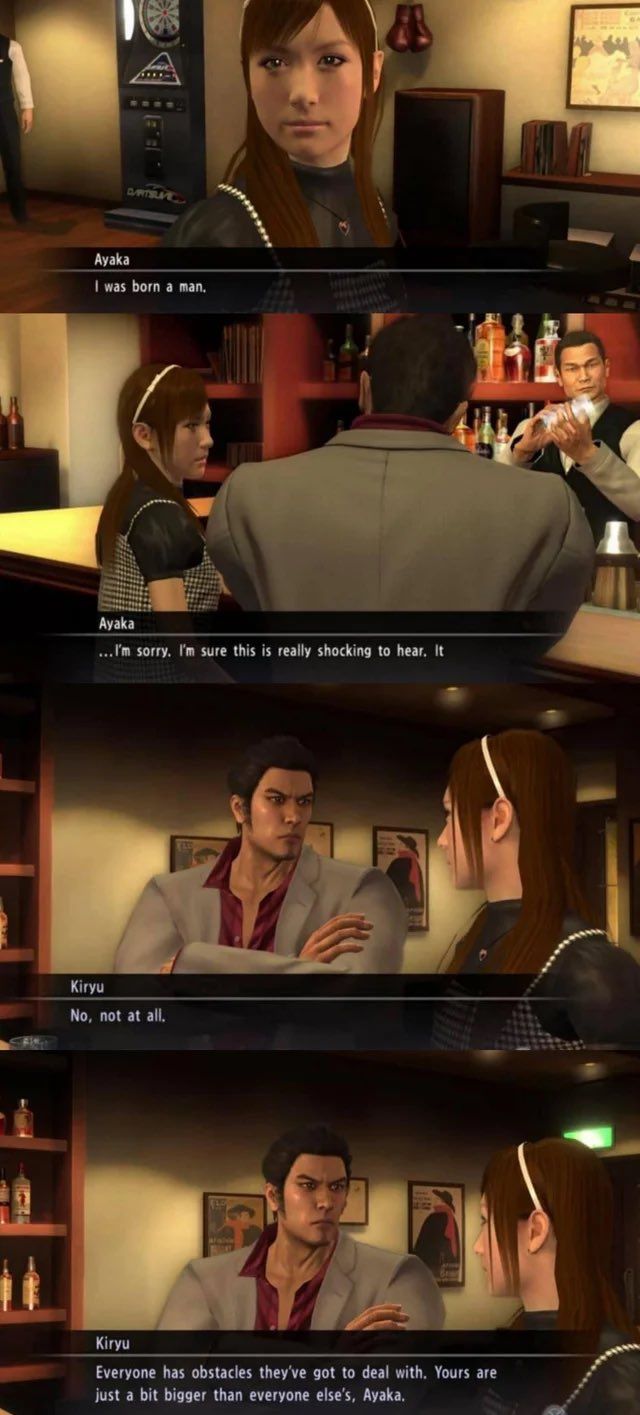 这段引发轩然大波的支线名为“和我说话”,主角是按摩师绫香(Ayaka),剧情中她向桐生一马坦白了自己的跨性别者身份,而桐生一马并未表现出丝毫偏见,反而以温和的语气安抚了绫香的自卑与不安。正是这段充满善意的对话,让许多玩家将桐生一马视作“跨性别友好”的代表性游戏角色,其被删减的消息一出,立刻点燃了玩家的不满情绪。