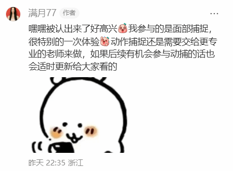 面对玩家的热烈关注,满月77主动回应了相关疑问,言语间难掩喜悦:“嘿嘿被认出来了好高兴,我参与的是面部捕捉,很特别的一次体验。动作捕捉还是需要交给更专业的老师来做,如果后续有机会参与动捕的话也会适时更新给大家看的。”