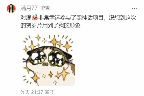 除了分享参与感受,满月77还表达了对游戏科学团队的感激之情,坦言能够参与黑神话系列项目,对自己而言是“非常非常幸运”的事,同时也透露,自己此前并未想到,这次参与拍摄的内容会直接出现在贺岁小短片中,直言意外又惊喜。