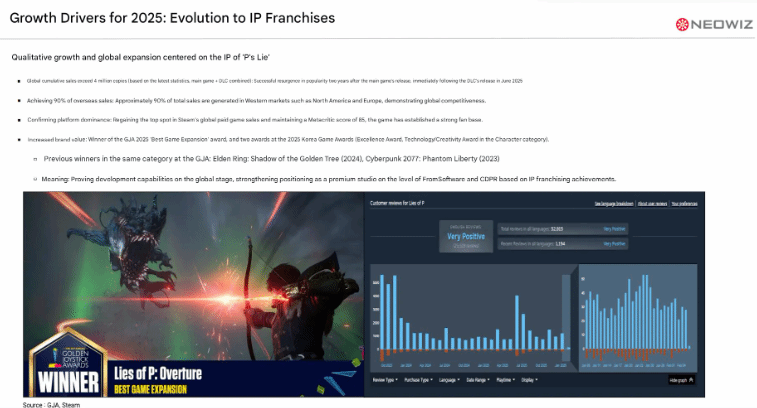 这款游戏不仅收获了全球类魂爱好者的广泛青睐,也为发行商Neowiz Games带来了丰厚的收益,截至目前,游戏本体与DLC的全球总销量已经达到400万份。对于《匹诺曹的谎言》这类2A级体量的游戏而言,400万份的销量已是相当亮眼的成绩,也为同类型游戏的发展提供了可参考的思路。Neowiz Games在最新发布的财报中明确表示,《匹诺曹的谎言》已成为公司的核心增长动力,而在这400万份销量中,有90%都来自北美、欧洲等西方市场。