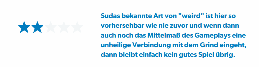 该媒体在简短评测中直言,须田刚一一贯标志性的怪诞风格,在这部新作里变得异常平庸。原本应是亮点的独特调性,搭配上枯燥乏味的刷级流程,形成了一种糟糕的搭配,最终让这款游戏彻底失去了吸引力,沦为一部难以让人认可的作品。