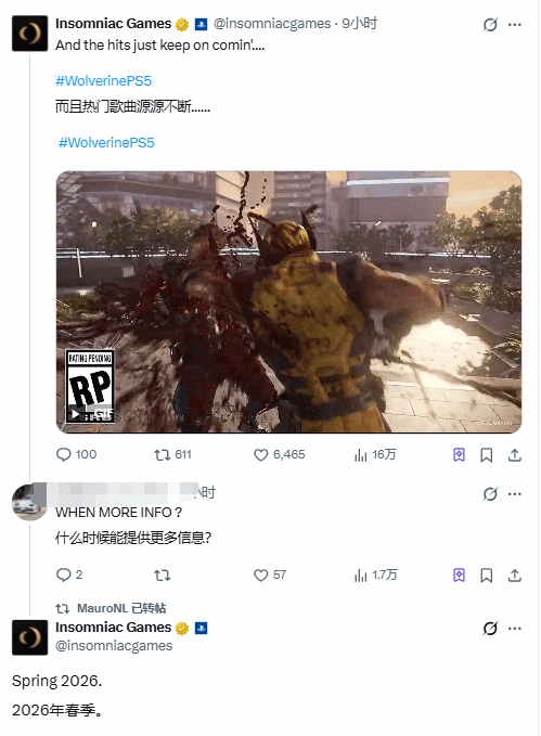 这个回应的时间点格外微妙。此前,索尼PlayStation官方已经对外宣布,将于本周五举办新一期的State of Play发布会,不少玩家原本都笃定,能在这场发布会上看到“狼叔”的实机演示画面。而失眠组此次明确表示,要等到2026年春季才会有后续动作,这一说法也被大量网友解读为,《漫威金刚狼》将会缺席本周五的这场PS发布会。