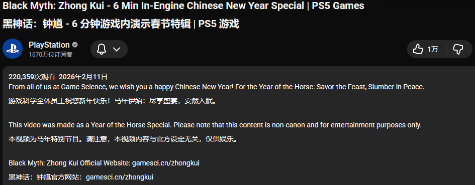 Logan Moore指出,PlayStation官方在其YouTube频道转发这支贺岁短片时,特意在标题中标注了“PS5游戏”的字样。这一细节看似不经意,却是目前首个明确迹象,暗示《黑神话:钟馗》将推出主机版本,只不过游戏科学方面尚未正式确认这一消息,始终保持着克制态度。