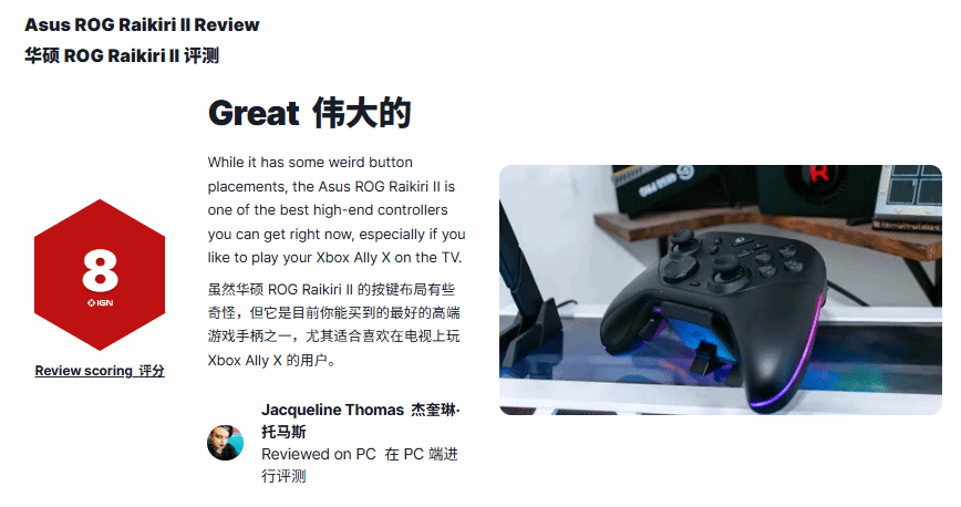 知名游戏媒体IGN近期完成了对华硕ROG Raikiri II手柄的评测,最终给出8分的优异成绩,并评价其为“目前市面上最出色的高端手柄之一”。