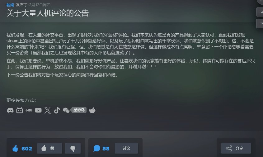 开发团队察觉异常后迅速发布声明,明确表示这些非真实玩家的“支持”不仅无助于游戏,反而可能带来严重后果。外媒分析指出,这很可能是竞争对手策划的一场“捧杀”:通过制造虚假好评数据,触发Steam平台对刷分行为的风控机制,导致游戏被限流、下架,或在算法推荐中被降权。同时,这种水军式吹捧也会让普通玩家产生反感,损害游戏口碑。