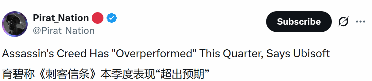 一则关于育碧内部对《刺客信条》系列业绩评价的消息在海外社交平台迅速传播。据一名博主透露,育碧方面认为该IP在本季度的商业成绩超出公司预期,甚至被视为近期整体业务中少有的亮点。