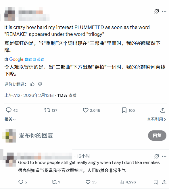社交平台上,支持与反对的声音迅速分化。有玩家直言,一听说是“完全重制”而非简单适配现代主机,立刻失去了兴趣。还有人表示,原本以为会是新作亮相,结果却是老内容翻新,期待感大打折扣。这类负面反馈比以往多数重制项目公布时更为明显。