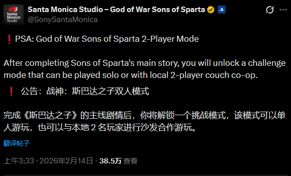 圣莫妮卡工作室新作《战神:斯巴达之子》近日正式发售,但不少玩家发现一个令人困惑的问题:尽管PlayStation商店页面明确标注本作支持“1至2名玩家”,可在游戏过程中却始终找不到任何多人合作的入口。