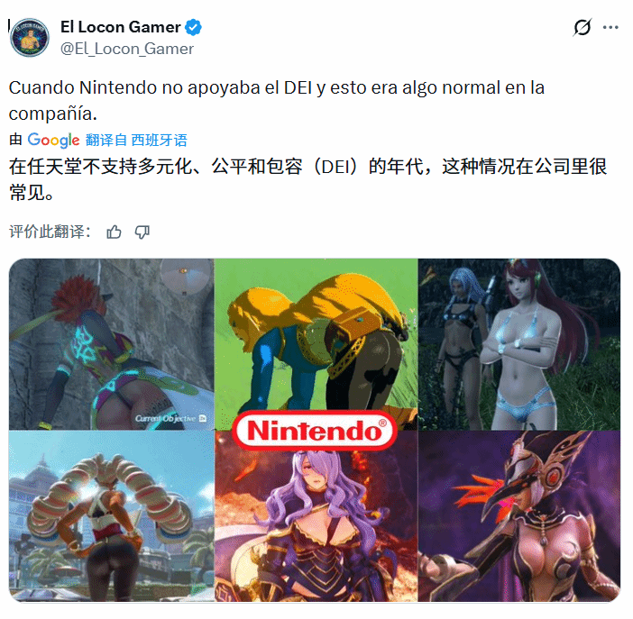 近日,推主@El_Locon_Gamer在社交平台发布了一张拼接图片,图片汇总了任天堂旗下多款热门游戏的女性角色,配文感慨道:“当任天堂还不支持DEI时,这样的角色设计在公司里曾是常态。”这番话话里有话,隐晦暗示如今任天堂的创作已经受到DEI理念的“负面影响”,角色设计不再有往日的风格。