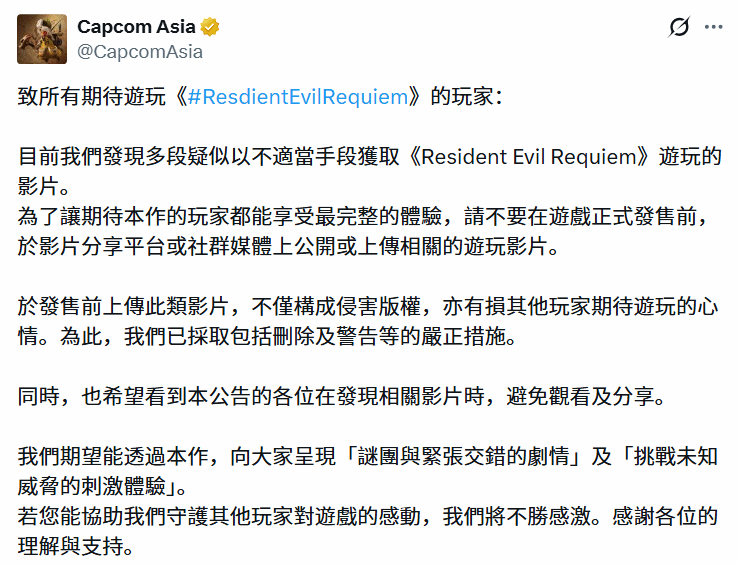 卡普空亚洲官方账号发布声明,对网上流传的《生化危机9》提前泄露内容表示强烈不满,并呼吁广大玩家主动避开相关信息。