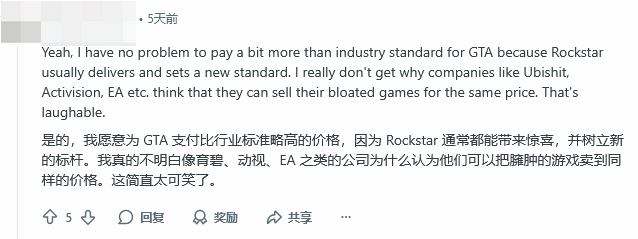 不过,也有一小部分玩家对这一定价表示理解和认可。他们认为,Rockstar作为业界顶尖开发商,其打造的《GTA》系列向来是品质标杆,尤其是《GTA6》历经多年开发,投入巨大,结合当下3A游戏开发成本飙升的行业现状,高价背后或许有其合理性,他们愿意为Rockstar的金字招牌买单,相信游戏质量能对得起这份定价。