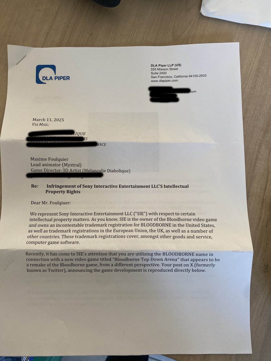 最令人愤慨的是索尼的双重标准,而独立开发者Maxime Foulquier,正是这种双标的直接受害者。近日,他在社交平台上公开了索尼此前发给自己的停止侵权函(C&D),据悉早在2025年3月,索尼就强硬要求他停止开发2024年底公布的《血源》同人重制项目,彻底扼杀了他的创作热情。