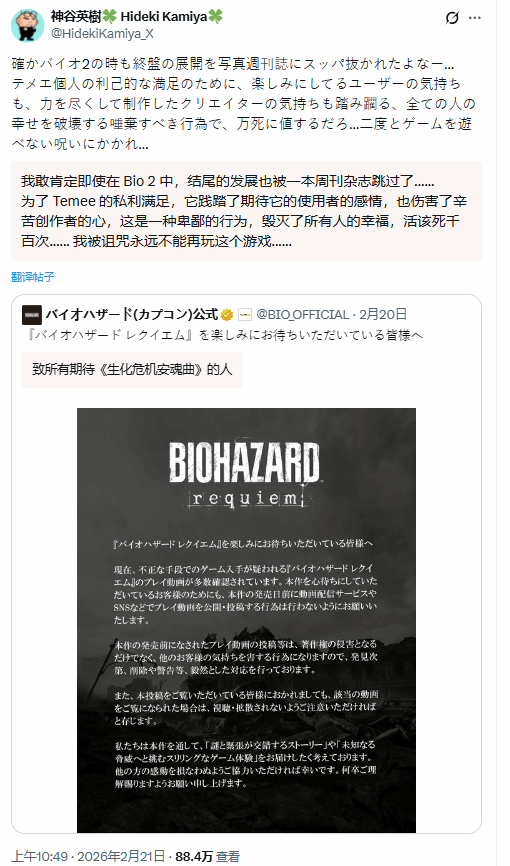 随着《生化危机:安魂曲》(Resident Evil Requiem,玩家俗称《生化9》)发售日益临近,网络上却开始疯传该作的剧情、结局等核心内容,大量泄密信息的扩散,不仅破坏了玩家的期待感,更激怒了系列传奇制作人神谷英树,这位曾执导原版《生化危机2》的大佬,在社交平台X上火力全开,用极其严厉的措辞痛斥泄密者。