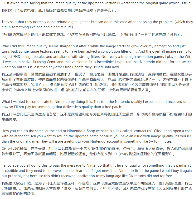 不满情绪持续发酵后,大量玩家选择通过退款的方式表达抗议。据悉,任天堂eShop平台向来有不接受数字游戏退款的惯例,但有玩家尝试列出游戏存在的各类画质问题,通过eShop“联系我们”页面与客服在线沟通后,成功获得了退款,并将这一方法分享出来——最快5至10分钟即可完成退款到账,不过该方法并非百分百成功。随后,不少玩家纷纷效仿,已有部分人成功退回升级包费用,退款潮进一步蔓延。