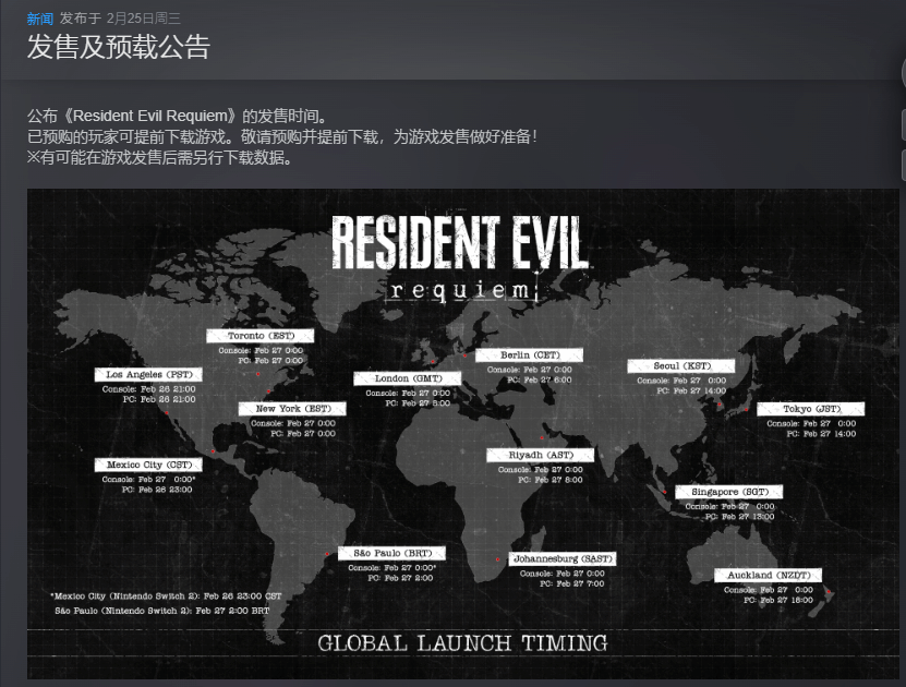卡普空官方于今日正式公布《生化危机9:安魂曲》的具体解锁时间,与此同时,PC版预载已同步开放,加上此前率先开启预载的PS5版,预购玩家可提前下载游戏,为即将到来的正式发售做好准备。