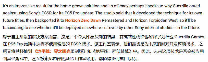 此次Guerrilla坚持走自主研发路线,而非直接套用主机默认的PSSR方案,显示出其对引擎底层优化的强大信心。尽管传闻中升级版的PSSR 2.0即将面世,旨在提升PlayStation整体的超分体验,但Guerrilla既然已手握专为自家引擎打磨成熟的工具,未来是否会继续深化这一技术路线,无疑值得业界持续关注。对于玩家而言,这意味着在特定大作中或许能体验到比通用方案更精准、更高效的画质提升效果。