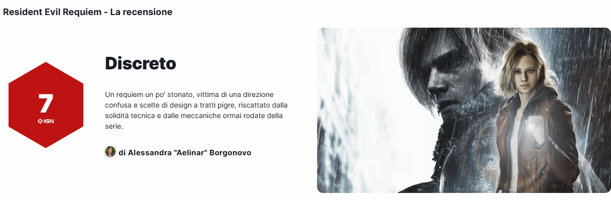 在玩法方面,得益于沿用了《生化危机4重制版》的成熟机制,游戏的射击手感和基础体验依然扎实可靠,画面表现也可圈可点。但在关卡设计的多样性上,本作未能超越前作的高度。IGN意大利总结道,作为系列的第九部正统续作,本有机会成为献给浣熊市的庄严终章或新时代的序曲,但最终却为了追求商业大片的视觉效果而牺牲了剧情逻辑与角色深度。对于格蕾丝这一潜力新角以及整个系列的世界观而言,这样的处理方式令人感到遗憾,玩家本应得到一个更加完整且大胆的结局。